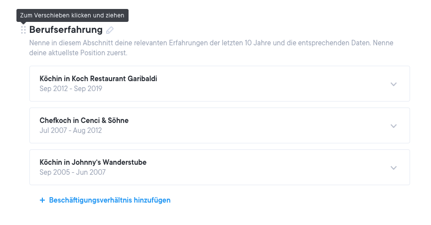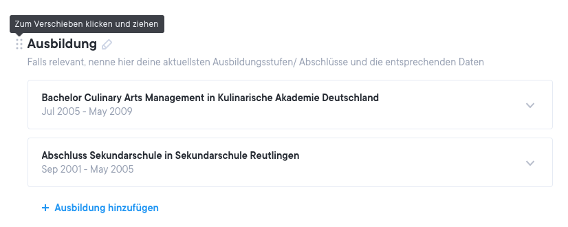 Abschnitte neu anordnen – du kannst jeden Abschnitt unter der Zusammenfassung im Hauptteil des Lebenslaufs neu anordnen. Um einen Abschnitt neu anzuordnen, klicke auf das Gittersymbol links neben dem Abschnitt, wie unten dargestellt. Daraufhin kannst du die Abschnitte nach oben oder nach unten ziehen. Siehe Screenshots unten.