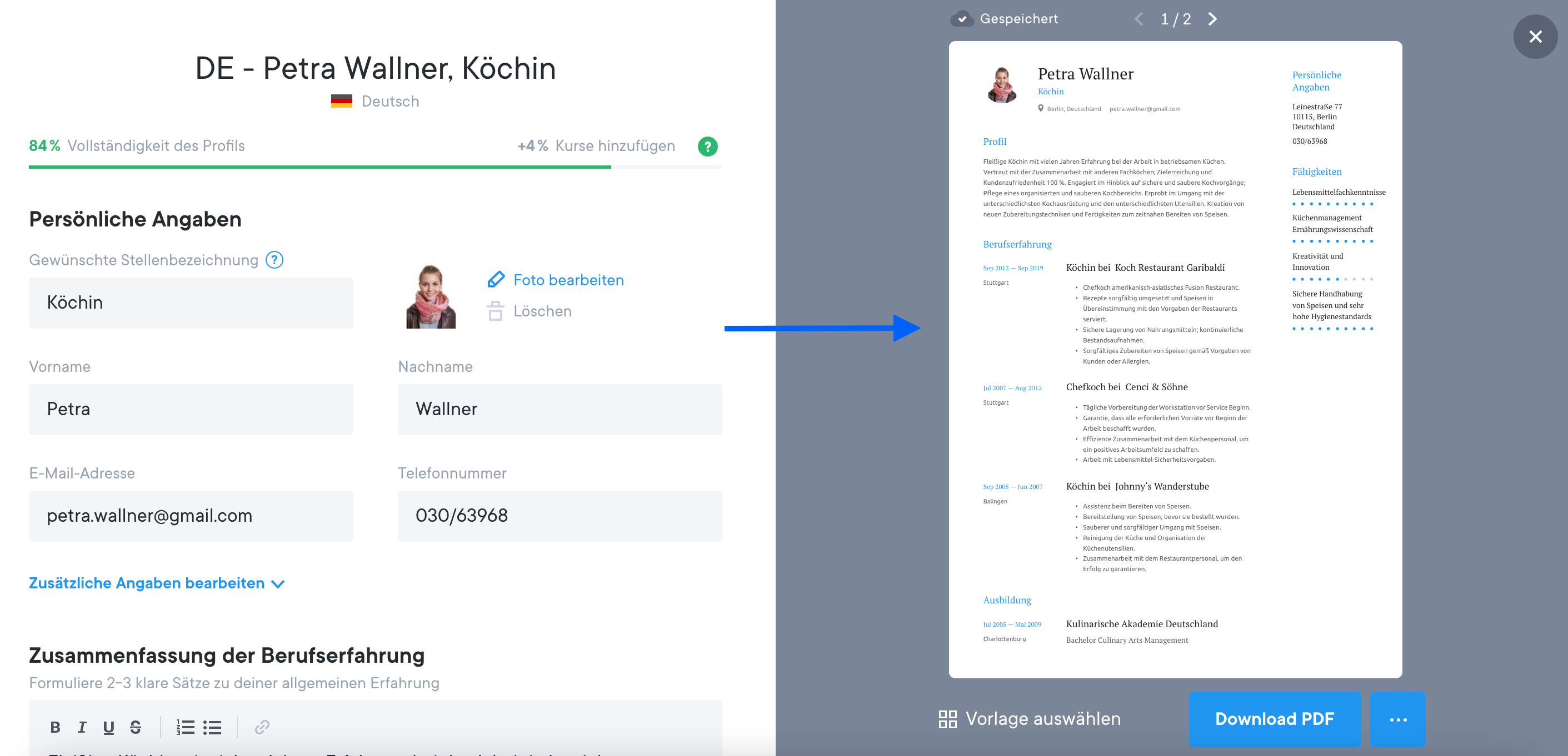 Nachdem du zu deinem Lebenslauf und Bewerbungsschreiben neue Inhalte hinzugefügt hast, kannst du dein Dokument in den Vorlagen zu jedem Zeitpunkt über die Vorschau ansehen. Deine Änderungen werden in der Vorschau in Echtzeit wiedergegeben.