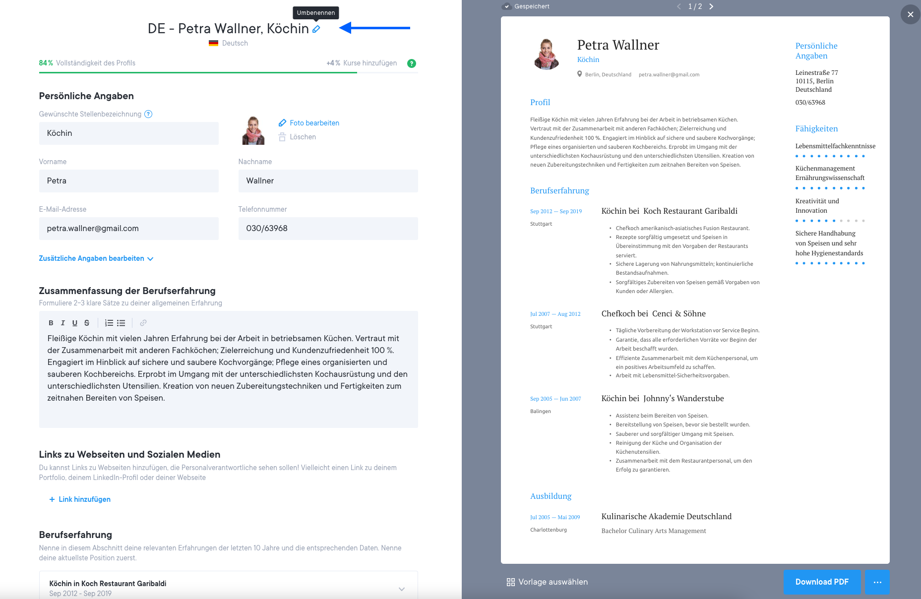 Unterschiedliche Versionen deines Lebenslaufs und deines Bewerbungsschreibens solltest du stets neu benennen. Du solltest deinem Lebenslauf und deinem Bewerbungsschreiben stets Namen geben, die dir bei der Organisation deiner Jobsuche behilflich sind. Häufig verwenden unsere Nutzer die jeweiligen Bezeichnungen der Positionen, für die sie sich bewerben. Es empfiehlt sich für unterschiedliche Stellenbewerbungen, die Lebensläufe und Bewerbungsschreiben unterschiedlich zuzuschneiden. Du kannst deinem Lebenslauf und deinem Bewerbungsschreiben ganz einfach einen neuen Namen geben, indem du auf die Bezeichnung des Dokumentes in deinem Dashboard klickst. Siehe Screenshot unten