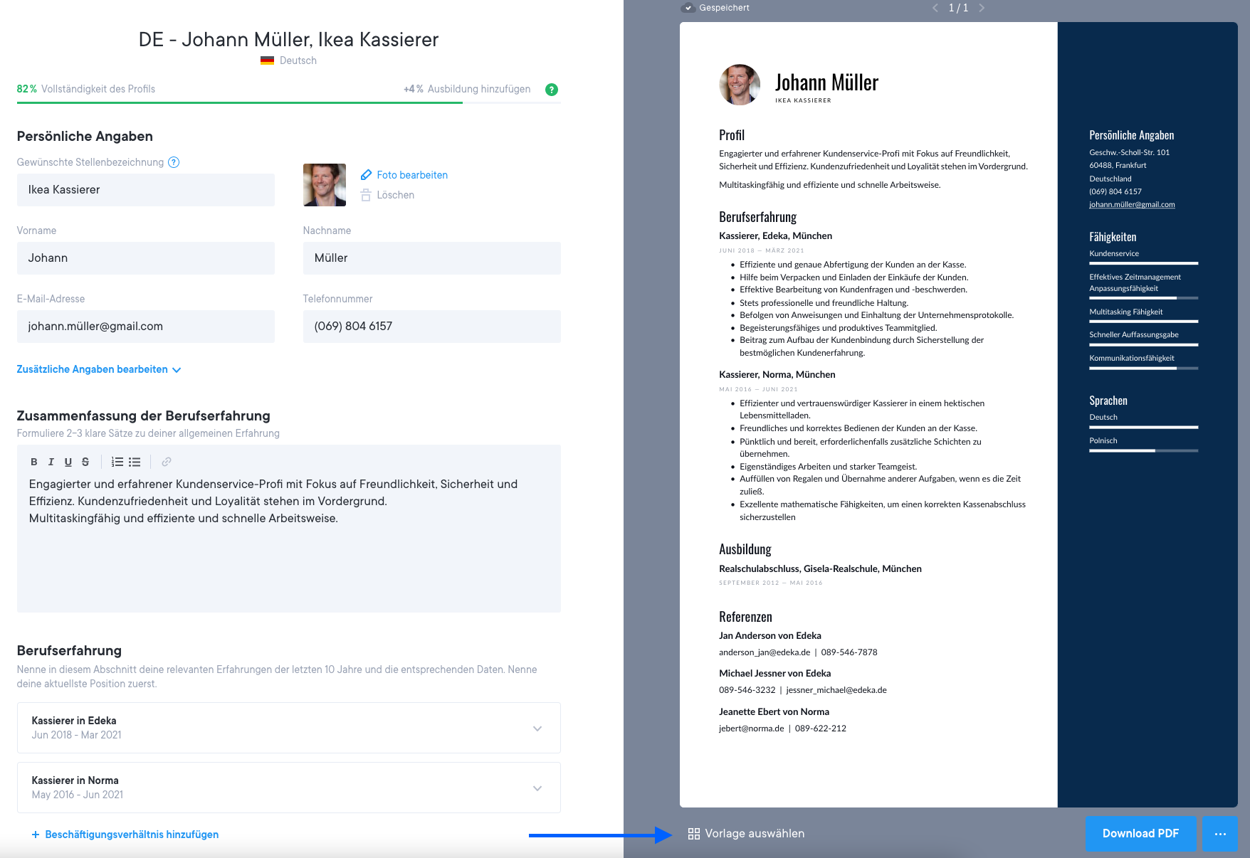 Sobald du deinen Lebenslauf erstellt hast, kannst du das Design oder die Vorlage im Nullkommanichts ändern. Du musst dir also keine Gedanken darum machen, die Inhalte gleich zu Beginn an das Design anzupassen.
