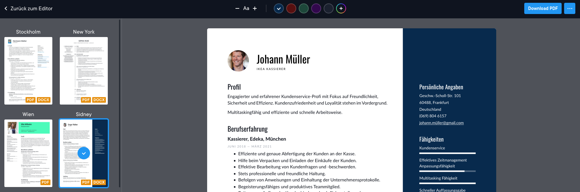 cvapp.de bietet unterschiedliche Designarten oder Vorlagen. Alle unsere Motive funktionieren mit den Inhalten deines Lebenslaufs. Du musst dir also keine Sorgen machen, die Inhalte zu ändern, so dass sie zum Design passen.