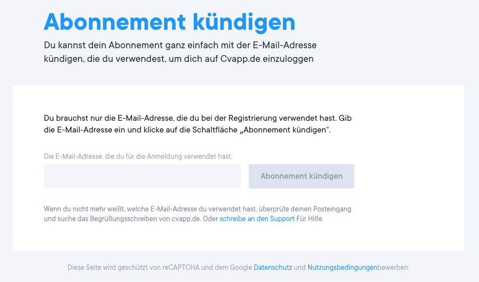 Hier hast du die Option, mit deiner E-Mail-Adresse nach deinem Account zu suchen. Sobald deine E-Mail-Adresse aufgerufen wurde, kannst du auf die entsprechende Schaltfläche klicken, um dein Abonnement zu kündigen. Gleich darauf senden wir dir eine Bestätigungs-E-Mail. Wenn du diese E-Mail nicht in wenigen Minuten erhältst, siehe in deinem Spam Ordner nach oder durchsuche deinen Posteingang nach cvapp.de.